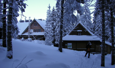 schronisko PTTK Markowe Szczawiny (vlevo nová chata ve výstavbě, vpravo stará) Dál pokračujeme po žluté tur. značce, nejprve asi půl km po vrstevnici, ale pak chodník odbočuje prudce nahoru. Tady potkáváme čtyři Poláky, ptáme se jich jestli je tato cesta průchozí, načež přikyvují, že asi ano. Tak tedy jdeme, po pár desítkách metrů je sklon opět přijatelný a my pozvolna stoupáme lesem dál (sněhu je tady čím dál tím víc, hůlky mě sem tam zajedou i metr do hloubky, ale na vyšlapaném chodníku se to neboří, takže se jde celkem fajn). Na konci lesa končí tato procházka a začíná opravdová dřina, stoupáme přímo vzhůru severním svahem Babí hory.