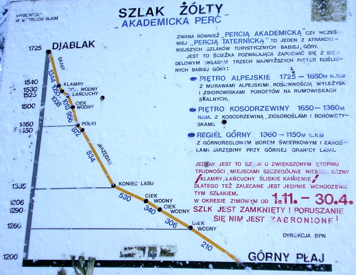 Akademicka Perč - naše výstupová trasa Jako výstupovou trasu jsme si zvolili částečně zajištěnou cestu "Akademicka Perč", vedoucí severním svahem Babí hory. Tak tedy výstup zahajujeme z vesničky Zawoja-Markowa (asi 650 m), zpočátku stoupáme pozvolna po zasněžené silničce a asi tak po 1,5 km odbočíme na chodník, který stoupá čím dál tím příkřeji, jdeme pořád po zelené tur. značce až k chatě "schronisko PTTK Markowe Szczawiny" (1180 m). Cesta sem nám trvala asi 1,5 hod.