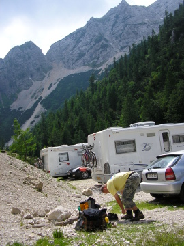 sedlo Vršič Celá tůra nám trvala 4 hodiny, rychle se odstrojujeme a už za deště odjíždíme hledat nocleh. Během několika minut ale musíme kvůli silnému krupobití zastavit a počkat pod nejbližším stromem až se to přežene. Vracíme se přes Kranjsku Goru do Mojstrany, během cesty se rozhodujeme, že přenocujeme na chatě Aljažev Dom, pokračujeme teda dál dolinou Vrata k Aljaževu Domu pod severní stěnou Triglavu. Za 7 EUR na osobu nás ubytovávají v podkroví chaty.