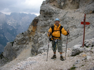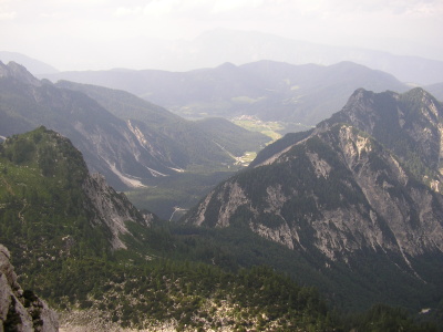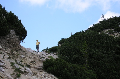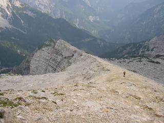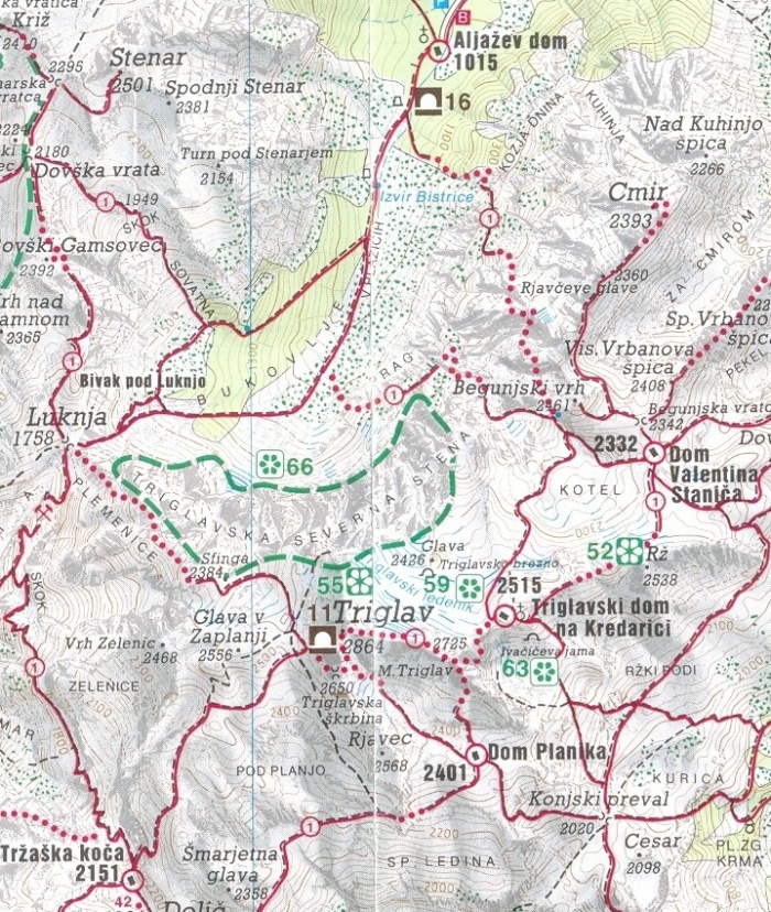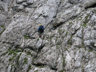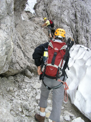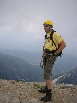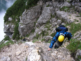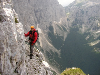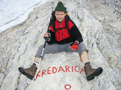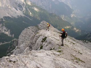 k uvedeným časům je nutno ještě aspoň třetinu připočíst Druhý den ráno vyrážíme po 8 hodině Tominškovou cestou na Kredaricu (časový údaj na rozcestníku nám říká 4:30 hod, nám to trvalo asi 7 hod). Od Aljaževa Domu jdeme po značené stezce, asi po 10 minutách odbočujeme do leva u Spomeniku padlim partizanom (velký hák s karabinou - památník padlých partyzánů). Chodník stoupá celkem příkře, takže nabíráme rychle výšku, nad hranicí lesa jsou některé exponované úseky stezky zajištěny ocelovými lany, oblékáme proto naše ferratové výstroje a pokračujeme dál.