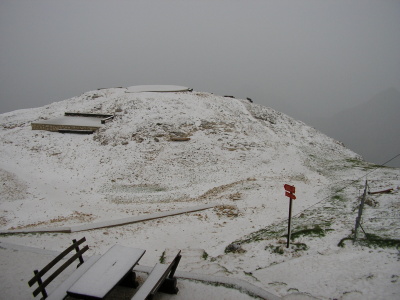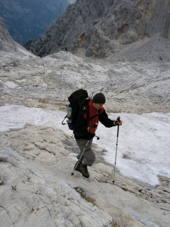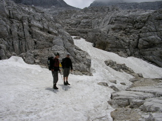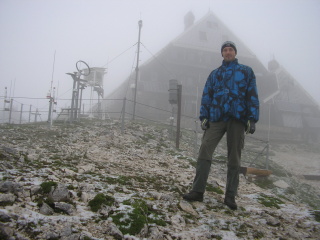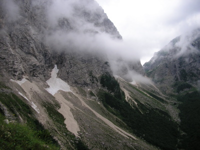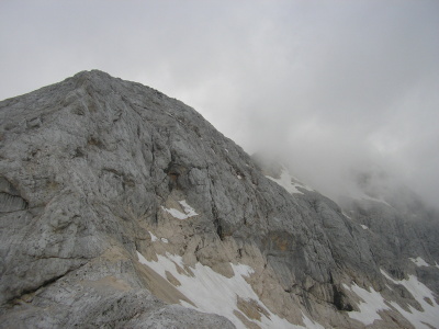 nahoře, schovaný v mracích - vrchol Triglavu (2864 m) Míjíme rozcestí s cestou Čez Prag, dál pokračujeme suťovým polem až k náhorní plošině pod Begunjským vrchem, po ní pozvolna vystoupáme až na Kredaricu. Na Triglavském Domu se ubytujeme za 18 EUR, v hospůdce si dáváme pivko a stanovujeme taktiku dalšího postupu. Dnes toho máme celkem dost, tak vrchol Triglavu (z chaty je to asi 1 hodina cesty) si necháváme na zítřejší ráno, možná bude i lepší počasí. V noci je bouřka a prší, ráno přijde další, navíc s krupobitím a do toho začne ještě sněžit, čekáme ještě asi do 10 hodin potom zahajujeme sestup zpět na Aljažev Dom.