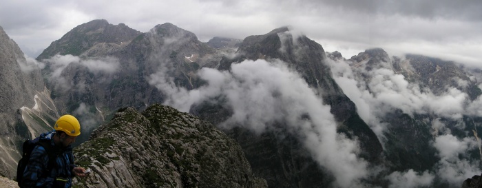 na vrcholu Malé Mojstrovky (2332 m) Zrovna, když se chystáme vytáhnout vlajku Valašského království a vyfotit pár vrcholových snímků začalo nad protějšími kopci bouřit, tak se radši nezdržujeme a spěcháme dolů. Sestupujeme po jižním hřbetu až do sedla, odtud skalním žlebem a suťovým polem zpět do sedla Vršič.